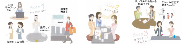 | まず、ご自身が「ヤマノ肌」になりキレイを体験。ご自身の体験をお友達やお知り合いに伝えながら化粧品を販売する |